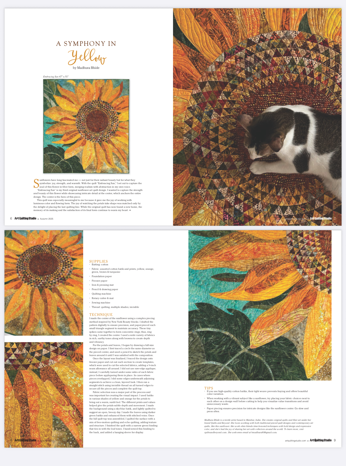 I am honored to have my quilted artwork and creative work recognized and featured in Art Quilting Studio magazine, a respected publication celebrating art quilts, textile artistry, and contemporary fiber art.