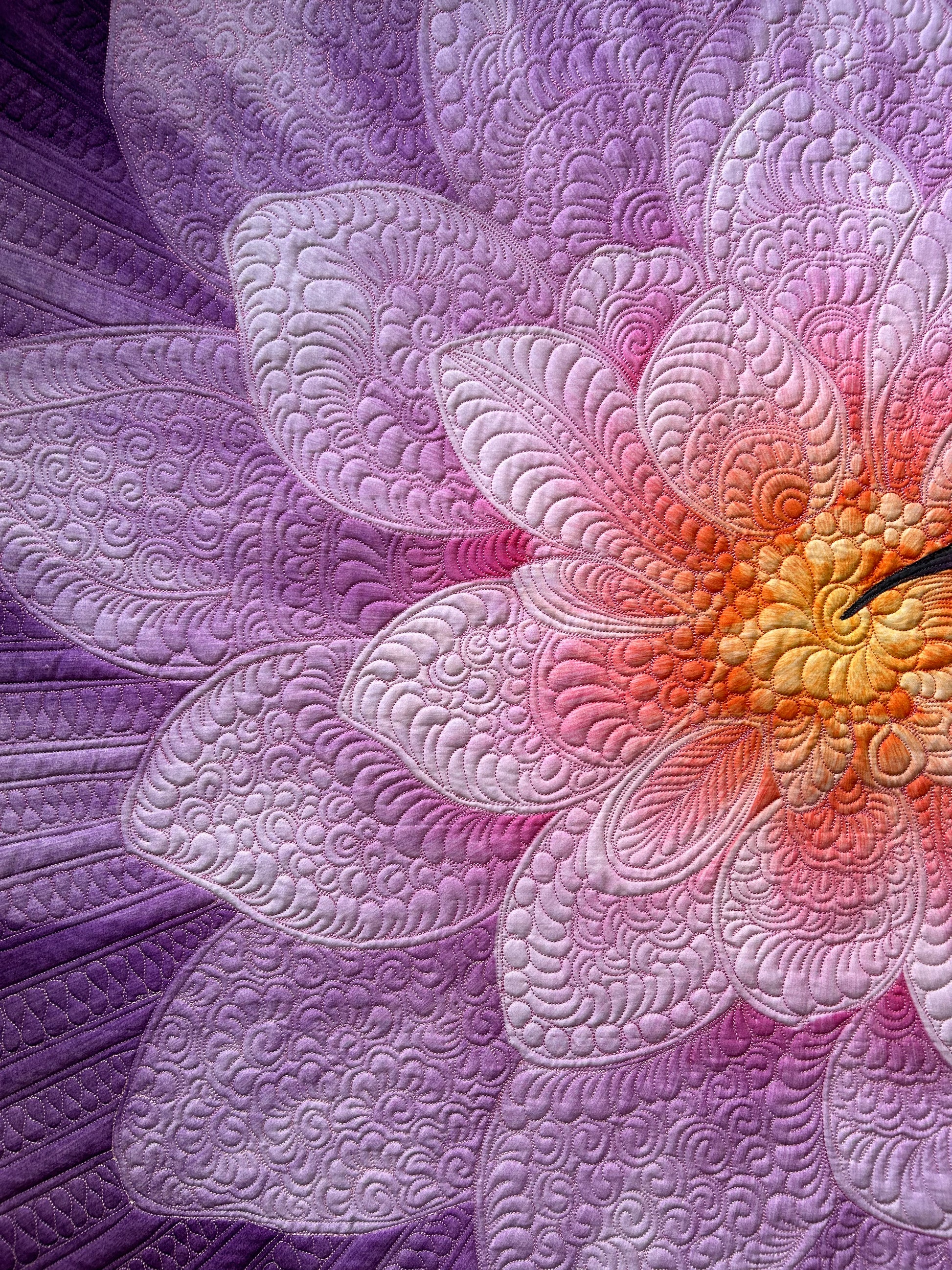 The quilting is exquisite. its all hand guided. very unique and one of a kind.